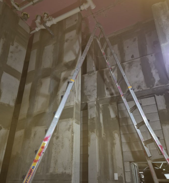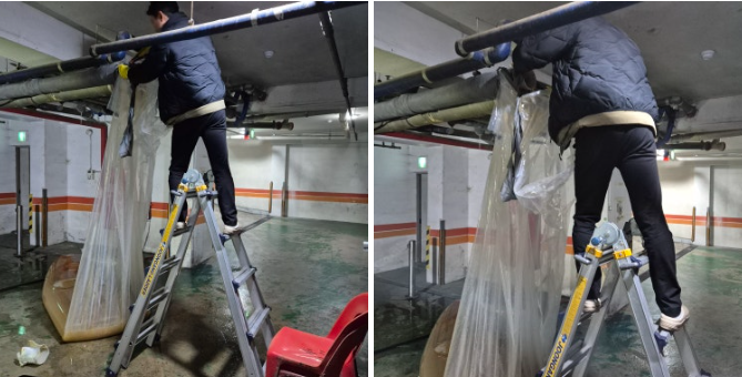 - 지하 주차장 천장에 위치한 배관 접근 위해 사다리 사용