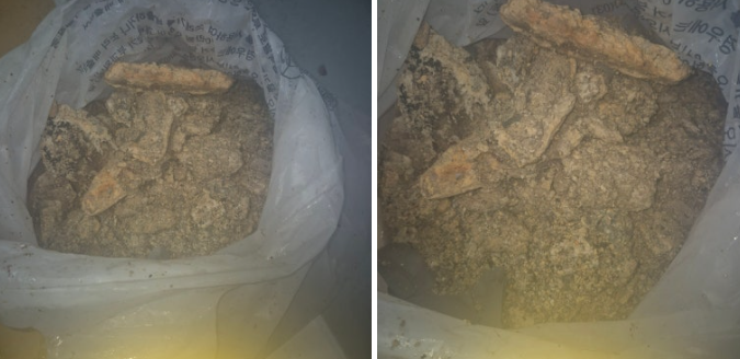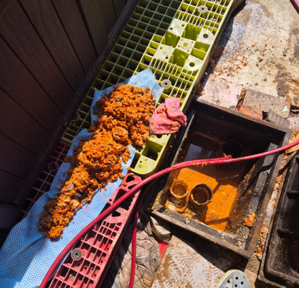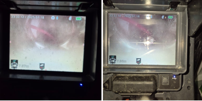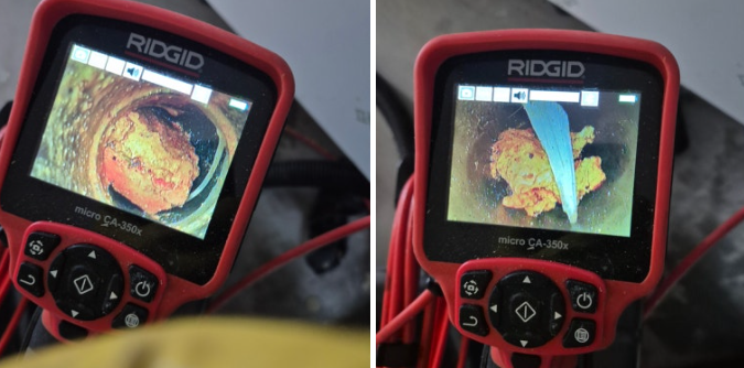 내시경 점검 결과, 하수관 꺾이는 부위에 슬러지(찌꺼기)가 쌓여 있었고 외부 하수관 쪽은 기름때와 이물질로 완전히 막혀 있었습니다.