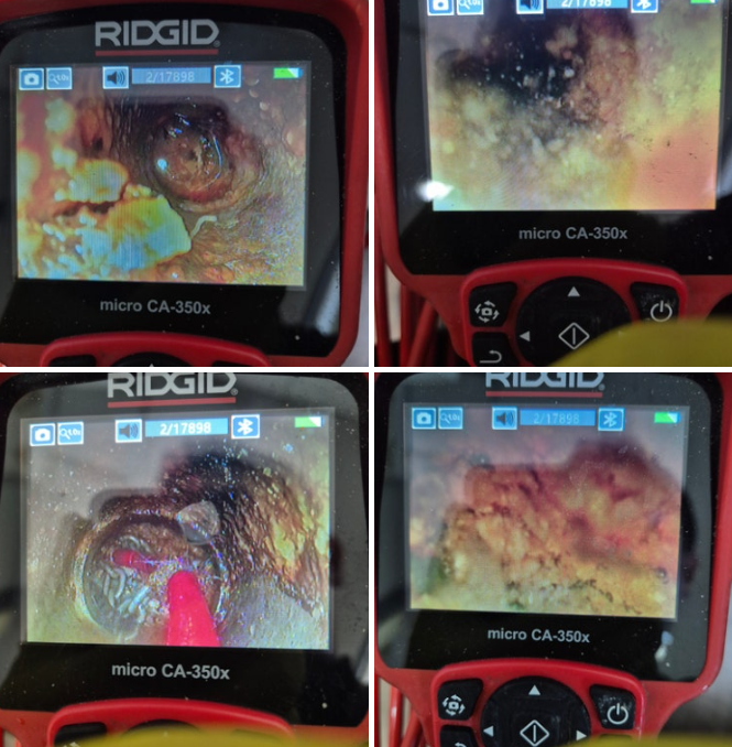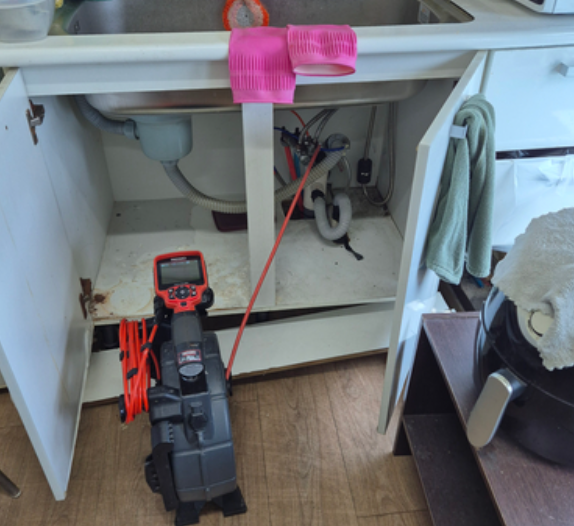 카메라로 직접 배관 내부를 확인해보니, 중간 구간마다 머리카락, 기름때, 음식물 찌꺼기가 층층이 쌓여 있었고 꺾인 부분에서는 이물질이 물 흐름을 완전히 차단하고 있었습니다.